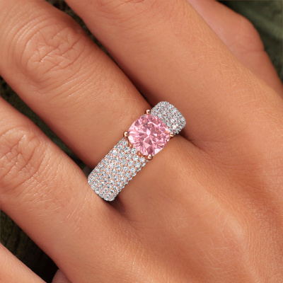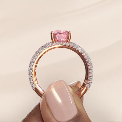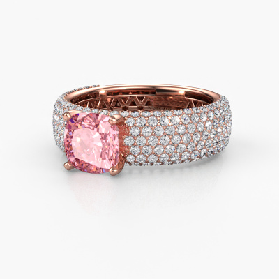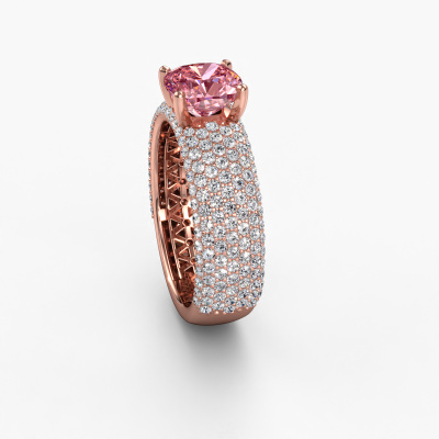 This 14 Carat rose gold ring is called Darcy and is set with 7 mm pink lab grown diamond. This exclusive rose gold pavé solitaire Engagement ring is a true work of art! The ornaments are crafted with a lot of patience and great passion. In order to create this ring with great precision, this craft requires a keen eye and skilful hand. A challenge which ignites a fire in our expert goldsmith. The exquisite pink lab grown diamonds are set in a special way so they stand out even more. This gives the ring an even more glamorous appearance. The pavé Engagement ring is actually unique on its own because of the gemstones which we carefully select especially for this ring. On top of that you select the precious metals which will be used to create a unique ring for the most extraordinary woman in your life! This jewel is unique in every way! Simply customize to your likingBecause we design and deliver our own rings, we can offer you a Engagement ring at a price you won't find anywhere else. A ring is made to order, which helps prevent excess supplies, so we can make you a great price offer. We understand it feels risky, buying your Engagement ring online, but we will gladly assist in the designing process, taking your budget into consideration.Different styles of new rings are made daily by our team. Perhaps you have found a pavé solitaire Engagement ring somewhere. One you would like to give to your loved one. Please feel free to share your thoughts and design with our jewel designers. We would love to turn your design into a exclusive Engagement ring. You can follow the development of your ring design because we use very detailed 3D drawings. On top of that, you can order a dummy of the design. A dummy is a plastic ring, which can be shaped according your ring design. You can try it on and check if the Engagement ring is up to standard. We will gladly send you a non-binding offer, based on a fair price/ quality ratio. The offer will baffle you, considering the quality of the ring and gemstones.To make it easier for you, we offer a 30 day return policy. Check our terms and conditions.