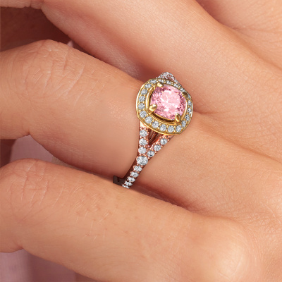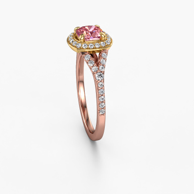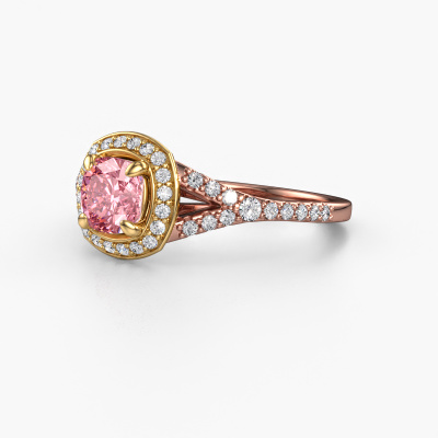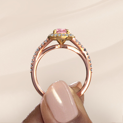 The ring shown above is called the Pamela CUS. We call this type of ring a halo ring because it has one centre gemstone and a band that is also pave set with gemstones. The 14 Carat rose gold engagement ring is set with a cushion 5.5 mm pink lab grown diamond centre stone and the band is pave set with lab-grown diamonds. What makes this luxury rose gold pavé solitaire ring special are the smaller sized stones embracing the centre stone. This gorgeous engagement ring is called a pavé solitaire ring because the smaller gemstones give the centre stone a pavé solitaire of surrounding light. In order for the smaller stones to enhance the centre stone, they have to be placed so there is no interference of light. And that's when our expert goldsmiths come in. Each individual stone is carefully set in the ring by hand. During manufacturing, light fall is constantly monitored to make sure the special pavé solitaire is still visible. In the end you get a unique engagement ring, with a pink lab grown diamond of your choosing at its centre. You can imagine the effect of a ring of such significance when you give it to her on her special day to shine. After receiving your order, our goldsmiths will passionately start the creative process of making your engagement ring in our own studio. Because we don't have a big stockpile, these costs will not be passed on to you. Our pricing is proof of that! We offer top quality jewels at lowest price, guaranteed.Different styles of new rings are made daily by our team. Perhaps you have found a pavé solitaire engagement ring somewhere. One you would like to give to your loved one. Please feel free to share your thoughts and design with our jewel designers. We would love to turn your design into a luxury engagement ring. You can follow the development of your ring design because we use very detailed 3D drawings. On top of that, you can order a dummy of the design. A dummy is a plastic ring, which can be shaped according your ring design. You can try it on and check if the engagement ring is up to standard. We will gladly send you a non-binding offer, based on a fair price/ quality ratio. The offer will baffle you, considering the quality of the ring and gemstones.To make it easier for you, we offer a 30 day return policy. Check our terms and conditions.