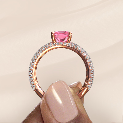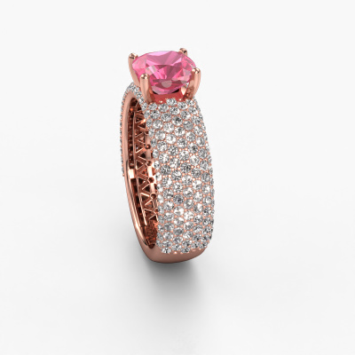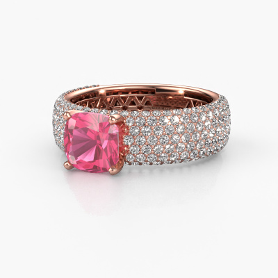 This 14 Carat rose gold ring is called Darcy and is set with 7 mm pink sapphire. This exclusive rose gold pavé solitaire Engagement ring is a true work of art! The ornaments are crafted with a lot of patience and great passion. In order to create this ring with great precision, this craft requires a keen eye and skilful hand. A challenge which ignites a fire in our expert goldsmith. The exquisite pink sapphire are set in a special way so they stand out even more. This gives the ring an even more glamorous appearance. The pavé Engagement ring is actually unique on its own because of the gemstones which we carefully select especially for this ring. On top of that you select the precious metals which will be used to create a unique ring for the most extraordinary woman in your life! This jewel is unique in every way! Simply customize to your likingBecause we design and deliver our own rings, we can offer you a Engagement ring at a price you won't find anywhere else. A ring is made to order, which helps prevent excess supplies, so we can make you a great price offer. We understand it feels risky, buying your Engagement ring online, but we will gladly assist in the designing process, taking your budget into consideration.Different styles of new rings are made daily by our team. Perhaps you have found a pavé solitaire Engagement ring somewhere. One you would like to give to your loved one. Please feel free to share your thoughts and design with our jewel designers. We would love to turn your design into a exclusive Engagement ring. You can follow the development of your ring design because we use very detailed 3D drawings. On top of that, you can order a dummy of the design. A dummy is a plastic ring, which can be shaped according your ring design. You can try it on and check if the Engagement ring is up to standard. We will gladly send you a non-binding offer, based on a fair price/ quality ratio. The offer will baffle you, considering the quality of the ring and gemstones.To make it easier for you, we offer a 30 day return policy. Check our terms and conditions.