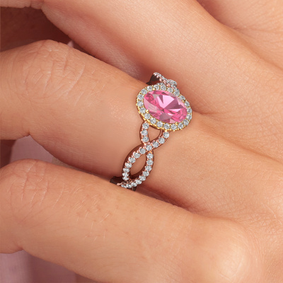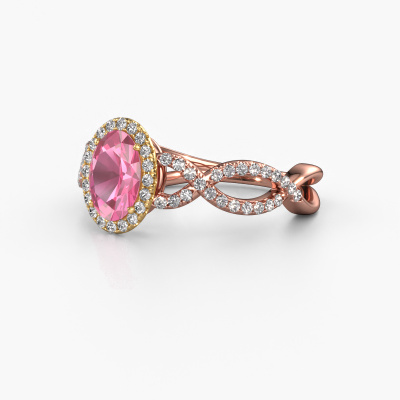 This 14 Carat rose gold ring is called Dionne ovl and is set with 7x5 mm pink sapphire. This exclusive rose gold pavé solitaire engagement ring is a true work of art! The ornaments are crafted with a lot of patience and great passion. In order to create this ring with great precision, this craft requires a keen eye and skilful hand. A challenge which ignites a fire in our expert goldsmith. The exquisite pink sapphire are set in a special way so they stand out even more. This gives the ring an even more glamorous appearance. The twisted engagement ring is actually unique on its own because of the gemstones which we carefully select especially for this ring. On top of that you select the precious metals which will be used to create a unique ring for the most extraordinary woman in your life! This jewel is unique in every way! Simply customize to your likingAfter receiving your order, our goldsmiths will start the creative process of making your Dionne ovl engagement ring. We don't keep stock. This is advantageous because these costs will not be passed on to you. Therefore, we can offer jewellery at exceptionally low prices.Different styles of new rings are made daily by our team. Perhaps you have found a pavé solitaire engagement ring somewhere. One you would like to give to your loved one. Please feel free to share your thoughts and design with our jewel designers. We would love to turn your design into a exclusive engagement ring. You can follow the development of your ring design because we use very detailed 3D drawings. On top of that, you can order a dummy of the design. A dummy is a plastic ring, which can be shaped according your ring design. You can try it on and check if the engagement ring is up to standard. We will gladly send you a non-binding offer, based on a fair price/ quality ratio. The offer will baffle you, considering the quality of the ring and gemstones.To make it easier for you, we offer a 30 day return policy. Check our terms and conditions.