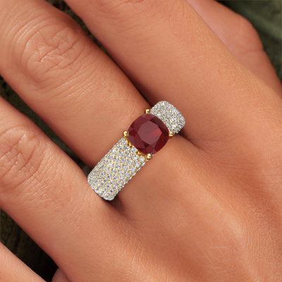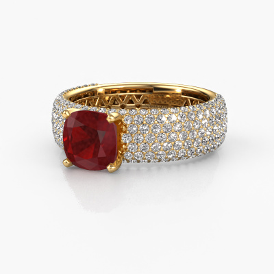 This 14 Carat gold ring is called Darcy and is set with 7 mm ruby. This exclusive gold pavé solitaire Engagement ring is a true work of art! The ornaments are crafted with a lot of patience and great passion. In order to create this ring with great precision, this craft requires a keen eye and skilful hand. A challenge which ignites a fire in our expert goldsmith. The exquisite ruby are set in a special way so they stand out even more. This gives the ring an even more glamorous appearance. The pavé Engagement ring is actually unique on its own because of the gemstones which we carefully select especially for this ring. On top of that you select the precious metals which will be used to create a unique ring for the most extraordinary woman in your life! This jewel is unique in every way! Simply customize to your likingBecause we design and deliver our own rings, we can offer you a Engagement ring at a price you won't find anywhere else. A ring is made to order, which helps prevent excess supplies, so we can make you a great price offer. We understand it feels risky, buying your Engagement ring online, but we will gladly assist in the designing process, taking your budget into consideration.Different styles of new rings are made daily by our team. Perhaps you have found a pavé solitaire Engagement ring somewhere. One you would like to give to your loved one. Please feel free to share your thoughts and design with our jewel designers. We would love to turn your design into a exclusive Engagement ring. You can follow the development of your ring design because we use very detailed 3D drawings. On top of that, you can order a dummy of the design. A dummy is a plastic ring, which can be shaped according your ring design. You can try it on and check if the Engagement ring is up to standard. We will gladly send you a non-binding offer, based on a fair price/ quality ratio. The offer will baffle you, considering the quality of the ring and gemstones.To make it easier for you, we offer a 30 day return policy. Check our terms and conditions.