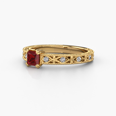 This 14 Carat gold ring is called Ardella and is set with 4 mm ruby. An extraordinary gold vintage ring. One that will surely make the love of your life shine like a diamond! That is what we hope to achieve. This vintage engagement ring is set with exquisite ruby. Whichever gemstone you choose from our selection, is up to you. The gemstone is selected with great care because we believe your filigree engagement ring must be adorned with nothing but the most beautiful gemstone. Wouldn't you agree? Our expert goldsmith will design your ring in our own crafting studio, where the ruby will be set with great precision. The ring will then be polished till it shines perfectly. Nothing but the best for the love of your life! This jewel is made just for you by our master goldsmiths in our own studio.After receiving your order, our goldsmiths will passionately start the creative process of making your engagement ring in our own studio. Because we don't have a big stockpile, these costs will not be passed on to you. Our pricing is proof of that! We offer top quality jewels at lowest price, guaranteed.Different styles of new rings are made daily by our team. Perhaps you have found a pavé solitaire engagement ring somewhere. One you would like to give to your loved one. Please feel free to share your thoughts and design with our jewel designers. We would love to turn your design into a vintage engagement ring. You can follow the development of your ring design because we use very detailed 3D drawings. On top of that, you can order a dummy of the design. A dummy is a plastic ring, which can be shaped according your ring design. You can try it on and check if the engagement ring is up to standard. We will gladly send you a non-binding offer, based on a fair price/ quality ratio. The offer will baffle you, considering the quality of the ring and gemstones.To make it easier for you, we offer a 30 day return policy. Check our terms and conditions.