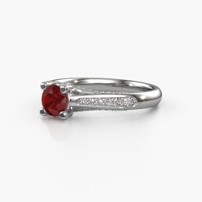 This platinum ring is called Mia 3 and is set with 5 mm ruby. This exclusive platinum pavé solitaire engagement ring is a true work of art! The ornaments are crafted with a lot of patience and great passion. In order to create this ring with great precision, this craft requires a keen eye and skilful hand. A challenge which ignites a fire in our expert goldsmith. The exquisite ruby are set in a special way so they stand out even more. This gives the ring an even more glamorous appearance. The shiny engagement ring is actually unique on its own because of the gemstones which we carefully select especially for this ring. On top of that you select the precious metals which will be used to create a unique ring for the most extraordinary woman in your life! This jewel is unique in every way! Simply customize to your likingAre you on a budget? Please feel free to contact us, so we can go discuss your options. We offer our engagement rings at guaranteed best price, because we make them to order. You won't find such a price anywhere else!Our team adds new designs to our online collection daily. Our designers and goldsmiths work together in creating the best design. We strive to offer a diverse collection of jewels. Perhaps you have a specific jewel design in mind. One you came across somewhere. Please contact us for a free consultation. We will make you an offer, based on a fair price/ quality ratio, that will baffle you.To make it easier for you, we offer a 30 day return policy. Check our terms and conditions.