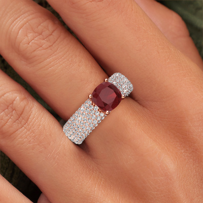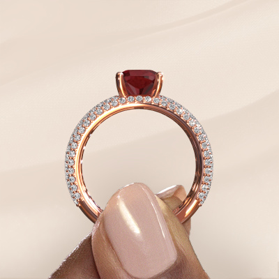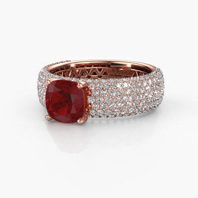 This 14 Carat rose gold ring is called Darcy and is set with 7 mm ruby. This exclusive rose gold pavé solitaire Engagement ring is a true work of art! The ornaments are crafted with a lot of patience and great passion. In order to create this ring with great precision, this craft requires a keen eye and skilful hand. A challenge which ignites a fire in our expert goldsmith. The exquisite ruby are set in a special way so they stand out even more. This gives the ring an even more glamorous appearance. The pavé Engagement ring is actually unique on its own because of the gemstones which we carefully select especially for this ring. On top of that you select the precious metals which will be used to create a unique ring for the most extraordinary woman in your life! This jewel is unique in every way! Simply customize to your likingBecause we design and deliver our own rings, we can offer you a Engagement ring at a price you won't find anywhere else. A ring is made to order, which helps prevent excess supplies, so we can make you a great price offer. We understand it feels risky, buying your Engagement ring online, but we will gladly assist in the designing process, taking your budget into consideration.Different styles of new rings are made daily by our team. Perhaps you have found a pavé solitaire Engagement ring somewhere. One you would like to give to your loved one. Please feel free to share your thoughts and design with our jewel designers. We would love to turn your design into a exclusive Engagement ring. You can follow the development of your ring design because we use very detailed 3D drawings. On top of that, you can order a dummy of the design. A dummy is a plastic ring, which can be shaped according your ring design. You can try it on and check if the Engagement ring is up to standard. We will gladly send you a non-binding offer, based on a fair price/ quality ratio. The offer will baffle you, considering the quality of the ring and gemstones.To make it easier for you, we offer a 30 day return policy. Check our terms and conditions.