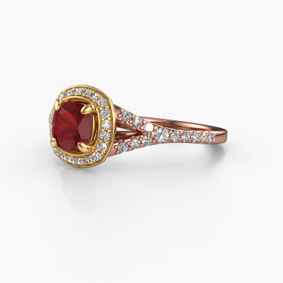 The ring shown above is called the Pamela CUS. We call this type of ring a halo ring because it has one centre gemstone and a band that is also pave set with gemstones. The 14 Carat rose gold engagement ring is set with a cushion 5.5 mm ruby centre stone and the band is pave set with lab-grown diamonds. What makes this luxury rose gold pavé solitaire ring special are the smaller sized stones embracing the centre stone. This gorgeous engagement ring is called a pavé solitaire ring because the smaller gemstones give the centre stone a pavé solitaire of surrounding light. In order for the smaller stones to enhance the centre stone, they have to be placed so there is no interference of light. And that's when our expert goldsmiths come in. Each individual stone is carefully set in the ring by hand. During manufacturing, light fall is constantly monitored to make sure the special pavé solitaire is still visible. In the end you get a unique engagement ring, with a ruby of your choosing at its centre. You can imagine the effect of a ring of such significance when you give it to her on her special day to shine. After receiving your order, our goldsmiths will passionately start the creative process of making your engagement ring in our own studio. Because we don't have a big stockpile, these costs will not be passed on to you. Our pricing is proof of that! We offer top quality jewels at lowest price, guaranteed.Different styles of new rings are made daily by our team. Perhaps you have found a pavé solitaire engagement ring somewhere. One you would like to give to your loved one. Please feel free to share your thoughts and design with our jewel designers. We would love to turn your design into a luxury engagement ring. You can follow the development of your ring design because we use very detailed 3D drawings. On top of that, you can order a dummy of the design. A dummy is a plastic ring, which can be shaped according your ring design. You can try it on and check if the engagement ring is up to standard. We will gladly send you a non-binding offer, based on a fair price/ quality ratio. The offer will baffle you, considering the quality of the ring and gemstones.To make it easier for you, we offer a 30 day return policy. Check our terms and conditions.