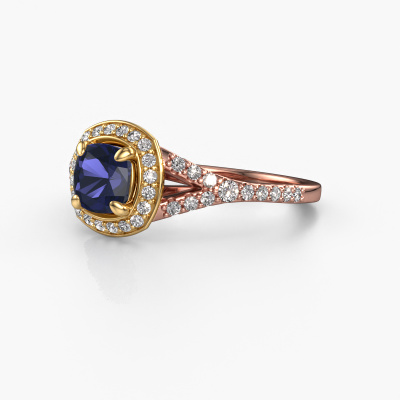 The ring shown above is called the Pamela CUS. We call this type of ring a halo ring because it has one centre gemstone and a band that is also pave set with gemstones. The 14 Carat rose gold engagement ring is set with a cushion 5.5 mm sapphire centre stone and the band is pave set with lab-grown diamonds. What makes this luxury rose gold pavé solitaire ring special are the smaller sized stones embracing the centre stone. This gorgeous engagement ring is called a pavé solitaire ring because the smaller gemstones give the centre stone a pavé solitaire of surrounding light. In order for the smaller stones to enhance the centre stone, they have to be placed so there is no interference of light. And that's when our expert goldsmiths come in. Each individual stone is carefully set in the ring by hand. During manufacturing, light fall is constantly monitored to make sure the special pavé solitaire is still visible. In the end you get a unique engagement ring, with a sapphire of your choosing at its centre. You can imagine the effect of a ring of such significance when you give it to her on her special day to shine. After receiving your order, our goldsmiths will passionately start the creative process of making your engagement ring in our own studio. Because we don't have a big stockpile, these costs will not be passed on to you. Our pricing is proof of that! We offer top quality jewels at lowest price, guaranteed.Different styles of new rings are made daily by our team. Perhaps you have found a pavé solitaire engagement ring somewhere. One you would like to give to your loved one. Please feel free to share your thoughts and design with our jewel designers. We would love to turn your design into a luxury engagement ring. You can follow the development of your ring design because we use very detailed 3D drawings. On top of that, you can order a dummy of the design. A dummy is a plastic ring, which can be shaped according your ring design. You can try it on and check if the engagement ring is up to standard. We will gladly send you a non-binding offer, based on a fair price/ quality ratio. The offer will baffle you, considering the quality of the ring and gemstones.To make it easier for you, we offer a 30 day return policy. Check our terms and conditions.