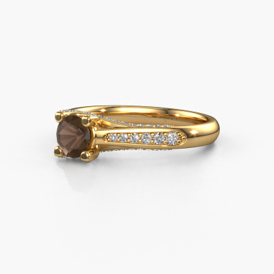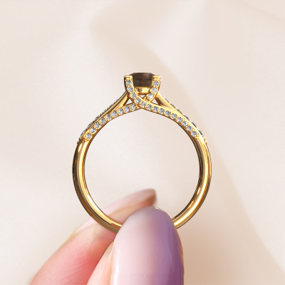 This 14 Carat gold ring is called Mia 3 and is set with 5 mm smokey quartz. This exclusive gold pavé solitaire engagement ring is a true work of art! The ornaments are crafted with a lot of patience and great passion. In order to create this ring with great precision, this craft requires a keen eye and skilful hand. A challenge which ignites a fire in our expert goldsmith. The exquisite smokey quartz are set in a special way so they stand out even more. This gives the ring an even more glamorous appearance. The shiny engagement ring is actually unique on its own because of the gemstones which we carefully select especially for this ring. On top of that you select the precious metals which will be used to create a unique ring for the most extraordinary woman in your life! This jewel is unique in every way! Simply customize to your likingAre you on a budget? Please feel free to contact us, so we can go discuss your options. We offer our engagement rings at guaranteed best price, because we make them to order. You won't find such a price anywhere else!Our team adds new designs to our online collection daily. Our designers and goldsmiths work together in creating the best design. We strive to offer a diverse collection of jewels. Perhaps you have a specific jewel design in mind. One you came across somewhere. Please contact us for a free consultation. We will make you an offer, based on a fair price/ quality ratio, that will baffle you.To make it easier for you, we offer a 30 day return policy. Check our terms and conditions.
