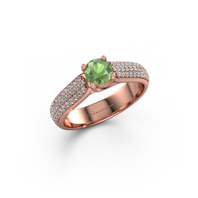 The ring shown above is called the Leoness. We call this type of ring a pavé solitaire ring. The centre gemstone is surrounded by smaller sized stones. This 14 Carat rose gold version is set with a 5 mm round tourmaline green centre stone, embraced by smaller diamonds. What makes this classic rose gold pavé solitaire ring special is the setting of the smaller gems surrounding the centre tourmaline green, which are shaped like a beautiful flower. The surrounding pavé solitaire of stones frame the middle centre stone in such a way to make it appear bigger. This type of engagement ring is also called a flower ring. It is very important that the smaller diamonds are positioned identically so there is no interference of light but perfect unity instead. Our skilled Goldsmiths get the job done. Each individual stone is carefully set by hand. During manufacturing, light fall is constantly monitored to make sure the special pavé solitaire effect is still visible. In the end you get the perfect engagement ring with a radiant tourmaline green gemstone centrepiece. You can imagine the effect of a ring of such significance when you give tot the love of your life on her special day to shine. This jewel is unique in every way! Simply customize to your liking,By using our modern techniques, we can design and customize the finest quality jewels with the utmost care for you. Our engagement rings are always priced 30 percent lower than other jewellers. We make engagement rings to order so we don't have to maintain a large stock. If you have a certain budget, we are more than happy to advice you accordingly.Have you found a specific engagement ring somewhere which you would like to give to your loved one? Please feel free to express your wishes to our jewel designers because we would be honoured to turn your design into a classic engagement ring. You can follow the development of your ring design because we use 3D drawings. This gives you a realistic preview of how your design will look. You can also preorder a dummy. A dummy is a plastic ring, which can be shaped according your ring design. You can try it on and check if its width and size are suitable for you. We will gladly send you a non-binding offer, based on a fair price/ quality ratio. It will amaze you, considering the quality of the ring and gemstones.To make it easier for you, we offer a 30 day return policy. Check our terms and conditions.