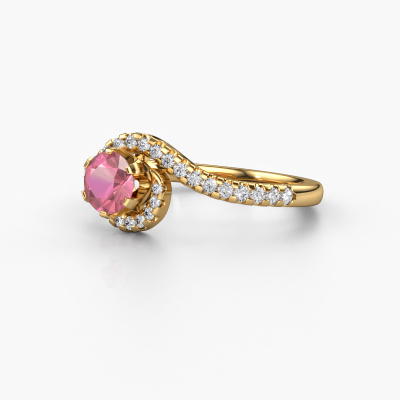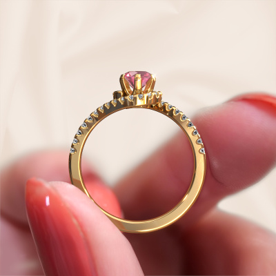 This 14 Carat gold ring is called Elli and is set with 5 mm tourmaline pink. This exclusive gold pavé solitaire engagement ring is a true work of art! The ornaments are crafted with a lot of patience and great passion. In order to create this ring with great precision, this craft requires a keen eye and skilful hand. A challenge which ignites a fire in our expert goldsmith. The exquisite tourmaline pink are set in a special way so they stand out even more. This gives the ring an even more glamorous appearance. The graceful engagement ring is actually unique on its own because of the gemstones which we carefully select especially for this ring. On top of that you select the precious metals which will be used to create a unique ring for the most extraordinary woman in your life! This jewel is made just for you, with attention to detail and design.After receiving your order, our goldsmiths will passionately start the creative process of making your engagement ring in our own studio. Because we don't have a big stockpile, these costs will not be passed on to you. Our pricing is proof of that! We offer top quality jewels at lowest price, guaranteed.Our designers and goldsmiths work together each day, creating new jewels. Perhaps you have found a nice exclusive engagement ring somewhere, which can be used to customize your unique ring. Please feel free to contact us. We will make you an offer, based on a fair price/ quality ratio, which will amaze you.To make it easier for you, we offer a 30 day return policy. Check our terms and conditions.