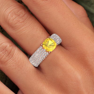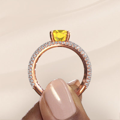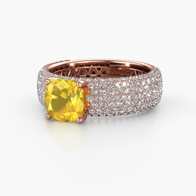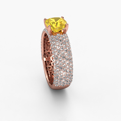 This 14 Carat rose gold ring is called Darcy and is set with 7 mm yellow sapphire. This exclusive rose gold pavé solitaire Engagement ring is a true work of art! The ornaments are crafted with a lot of patience and great passion. In order to create this ring with great precision, this craft requires a keen eye and skilful hand. A challenge which ignites a fire in our expert goldsmith. The exquisite yellow sapphire are set in a special way so they stand out even more. This gives the ring an even more glamorous appearance. The pavé Engagement ring is actually unique on its own because of the gemstones which we carefully select especially for this ring. On top of that you select the precious metals which will be used to create a unique ring for the most extraordinary woman in your life! This jewel is unique in every way! Simply customize to your likingBecause we design and deliver our own rings, we can offer you a Engagement ring at a price you won't find anywhere else. A ring is made to order, which helps prevent excess supplies, so we can make you a great price offer. We understand it feels risky, buying your Engagement ring online, but we will gladly assist in the designing process, taking your budget into consideration.Different styles of new rings are made daily by our team. Perhaps you have found a pavé solitaire Engagement ring somewhere. One you would like to give to your loved one. Please feel free to share your thoughts and design with our jewel designers. We would love to turn your design into a exclusive Engagement ring. You can follow the development of your ring design because we use very detailed 3D drawings. On top of that, you can order a dummy of the design. A dummy is a plastic ring, which can be shaped according your ring design. You can try it on and check if the Engagement ring is up to standard. We will gladly send you a non-binding offer, based on a fair price/ quality ratio. The offer will baffle you, considering the quality of the ring and gemstones.To make it easier for you, we offer a 30 day return policy. Check our terms and conditions.