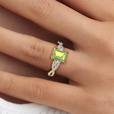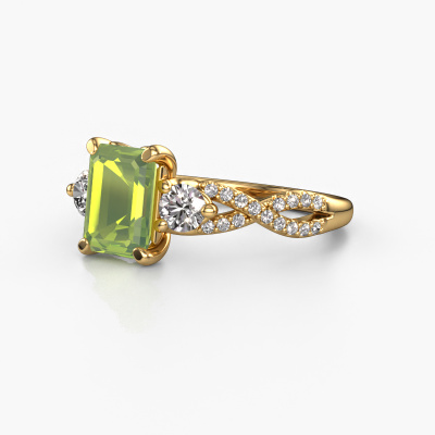 This 14 Carat gold ring is called Marilou EME and is set with peridot. How would you describe the style of the love of your life? Does she have a unique sense of style? This stunning split band gold engagement ring can be custom-made to your own or her liking. Our peridot gemstones have been carefully selected because we believe your luxury engagement ring must be adorned with nothing but the most beautiful gemstone. Don't you agree? This jewel is made to shine bright around your finger. Each jewel is hand made with love by our goldsmiths.After receiving your order, our goldsmiths will start the creative process of making your Marilou EME engagement ring. We don't keep stock. This is advantageous because these costs will not be passed on to you. Therefore, we can offer jewellery at exceptionally low prices.Do you have a specific ring in mind? One you came across somewhere. Please feel free to tell us your wishes and we will turn your design into a unique engagement ring. You can follow the development of your ring design because we use 3D drawings. This gives you a realistic preview of your design. We will gladly send you a non-binding offer, based on a fair price/ quality ratio. It will amaze you.To make it easier for you, we offer a 30 day return policy. Check our terms and conditions.