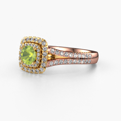 The ring shown above is called the Annette. We call this type of ring a halo ring because it has one centre gemstone and a band that is also pave set with gemstones. The 14 Carat rose gold engagement ring is set with a round 5 mm peridot centre stone and the band is pave set with diamond gemstones. Each jewel is made just for you by our master goldsmiths in our own studio.This vintage rose gold halo engagement ring has an exquisite round peridot centre stone. To further accentuate the centre stone, the band is fully set with more diamonds. Its open prong setting allows light to strike the peridot from various angles and this adds sparkle to your peridot ring. The photo shown above depicts the goldsmith's carefully handcrafted details of the ring. The high positioning of the centre stone is truly eye-catching. The perfect engagement ring for the crown jewel of your life! After receiving your order, our goldsmiths will passionately start the creative process of making your engagement ring in our own studio. Because we don't have a big stockpile, these costs will not be passed on to you. Our pricing is proof of that! We offer top quality jewels at lowest price, guaranteed.Have you found a specific engagement ring somewhere which you would like to give to your loved one? Please feel free to express your wishes to our jewel designers because we would be honoured to turn your design into a vintage engagement ring. You can follow the development of your ring design because we use 3D drawings. This gives you a realistic preview of how your design will look. You can also preorder a dummy. A dummy is a plastic ring, which can be shaped according your ring design. You can try it on and check if its width and size are suitable for you. We will gladly send you a non-binding offer, based on a fair price/ quality ratio. It will amaze you, considering the quality of the ring and gemstones.To make it easier for you, we offer a 30 day return policy. Check our terms and conditions.