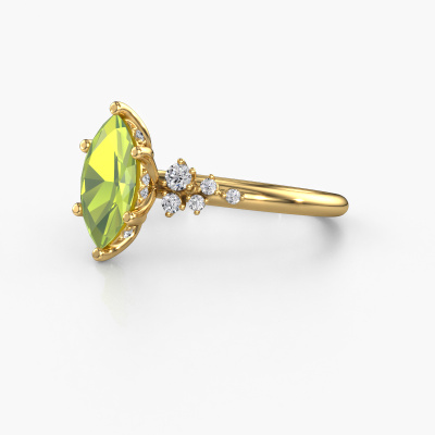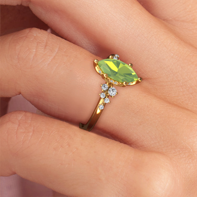 This 14 Carat gold ring is called Emma MRQ and is set with peridot. How would you describe the style of the love of your life? Does she have a unique sense of style? This stunning special gold engagement ring can be custom-made to your own or her