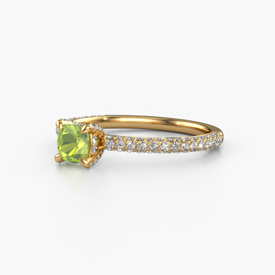 The ring shown above is called the Saskia 2 cus. We call this type of ring a pavé solitaire ring because it has one centre gemstone and a band that is also pave set with gemstones. The 14 Carat gold engagement ring is set with a cushion 4.5 mm peridot centre stone and the band is pave set with lab grown diamond gemstones. Each jewel is made just for you, with attention to detail and design.This contemporary gold pavé solitaire engagement ring has an exquisite cushion peridot centre stone. To further accentuate the centre stone, the band is fully set with more lab-grown diamonds. Its open prong setting allows light to strike the peridot from various angles and this adds sparkle to your peridot ring. The photo shown above depicts the goldsmith's carefully handcrafted details of the ring. The high positioning of the centre stone is truly eye-catching. The perfect engagement ring for the crown jewel of your life! Are you on a budget? Please feel free to contact us, so we can go discuss your options. We offer our engagement rings at guaranteed best price, because we make them to order. You won't find such a price anywhere else!Our designers and goldsmiths work together each day, creating new jewels. Perhaps you have found a nice contemporary engagement ring somewhere, which can be used to customize your unique ring. Please feel free to contact us. We will make you an offer, based on a fair price/ quality ratio, which will amaze you.To make it easier for you, we offer a 30 day return policy. Check our terms and conditions.