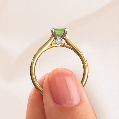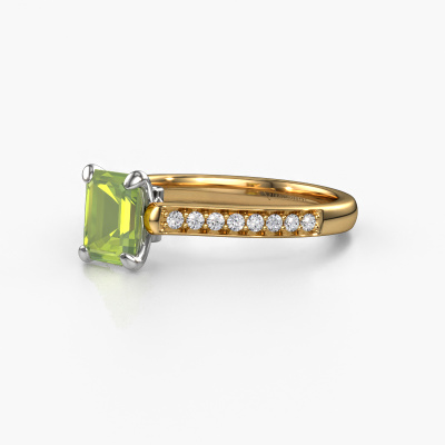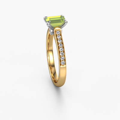 The ring shown above is called the Valorie eme 2. We call this type of ring a pavé solitaire ring because it has one centre gemstone and a band that is also pave set with gemstones. The 14 Carat gold engagement ring is set with a emerald cut 6.5x4.5 mm peridot centre stone and the band is pave set with diamond gemstones. Each jewel is made by a team of passionate goldsmiths and jewel designers. This will make your crown jewel truly eye-catching.This classic gold pavé solitaire engagement ring has an exquisite emerald cut peridot centre stone. To further accentuate the centre stone, the band is fully set with more diamonds. Its open prong setting allows light to strike the peridot from various angles and this adds sparkle to your peridot ring. The photo shown above depicts the goldsmith's carefully handcrafted details of the ring. The high positioning of the centre stone is truly eye-catching. The perfect engagement ring for the crown jewel of your life! By using our modern techniques, we can design and customize the finest quality jewels with the utmost care for you. Our engagement rings are always priced 30 percent lower than other jewellers. We make engagement rings to order so we don't have to maintain a large stock. If you have a certain budget, we are more than happy to advice you accordingly.Have you found a specific engagement ring somewhere which you would like to give to your loved one? Please feel free to express your wishes to our jewel designers because we would be honoured to turn your design into a classic engagement ring. You can follow the development of your ring design because we use 3D drawings. This gives you a realistic preview of how your design will look. You can also preorder a dummy. A dummy is a plastic ring, which can be shaped according your ring design. You can try it on and check if its width and size are suitable for you. We will gladly send you a non-binding offer, based on a fair price/ quality ratio. It will amaze you, considering the quality of the ring and gemstones.To make it easier for you, we offer a 30 day return policy. Check our terms and conditions.