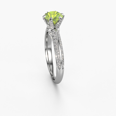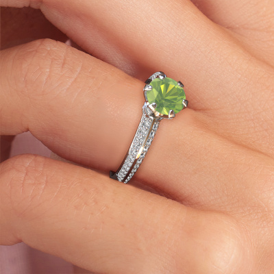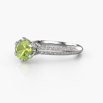 The ring shown above is called the Abby. We call this type of ring a pavé solitaire ring because it has one centre gemstone and a band that is also pave set with gemstones. The platinum engagement ring is set with a round 6.5 mm peridot centre stone and the band is pave set with diamond gemstones. Each jewel is made just for you by our master goldsmiths in our own studio.This exclusive platinum pavé solitaire engagement ring has an exquisite round peridot centre stone. To further accentuate the centre stone, the band is fully set with more diamonds. Its open prong setting allows light to strike the peridot from various angles and this adds sparkle to your peridot ring. The photo shown above depicts the goldsmith's carefully handcrafted details of the ring. The high positioning of the centre stone is truly eye-catching. The perfect engagement ring for the crown jewel of your life! Are you on a budget? Please feel free to contact us, so we can go discuss your options. We offer our engagement rings at guaranteed best price, because we make them to order. You won't find such a price anywhere else!Our team adds new designs to our online collection daily. Our designers and goldsmiths work together in creating the best design. We strive to offer a diverse collection of jewels. Perhaps you have a specific jewel design in mind. One you came across somewhere. Please contact us for a free consultation. We will make you an offer, based on a fair price/ quality ratio, that will baffle you.To make it easier for you, we offer a 30 day return policy. Check our terms and conditions.