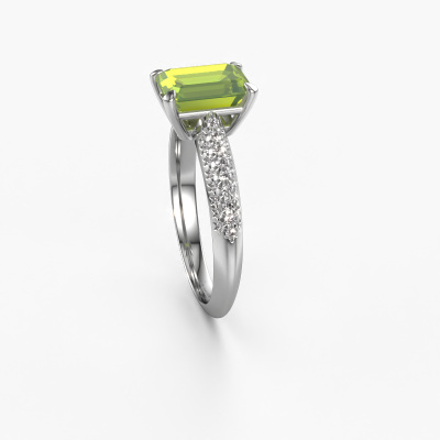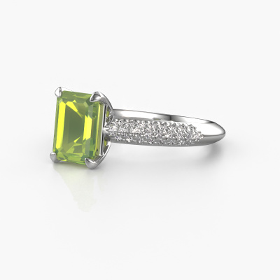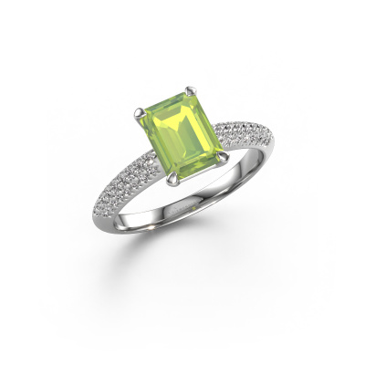 The ring shown above is called the Morane EME. We call this type of ring a pavé solitaire ring because it has one centre gemstone and a band that is also pave set with gemstones. The platinum engagement ring is set with a emerald cut 8x6 mm peridot centre stone and the band is pave set with lab grown diamond gemstones. Each jewel is made just for you by our master goldsmiths in our own studio.This unique platinum pavé solitaire engagement ring has an exquisite emerald cut peridot centre stone. To further accentuate the centre stone, the band is fully set with more lab-grown diamonds. Its open prong setting allows light to strike the peridot from various angles and this adds sparkle to your peridot ring. The photo shown above depicts the goldsmith's carefully handcrafted details of the ring. The high positioning of the centre stone is truly eye-catching. The perfect engagement ring for the crown jewel of your life! After receiving your order, our goldsmiths will passionately start the creative process of making your engagement ring in our own studio. Because we don't have a big stockpile, these costs will not be passed on to you. Our pricing is proof of that! We offer top quality jewels at lowest price, guaranteed.Our team adds new designs to our online collection daily. Our designers and goldsmiths work together in creating the best design. We strive to offer a diverse collection of jewels. Perhaps you have a specific jewel design in mind. One you came across somewhere. Please contact us for a free consultation. We will make you an offer, based on a fair price/ quality ratio, that will baffle you.To make it easier for you, we offer a 30 day return policy. Check our terms and conditions.