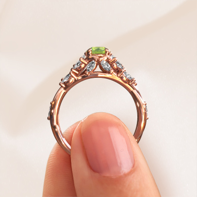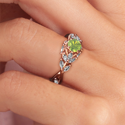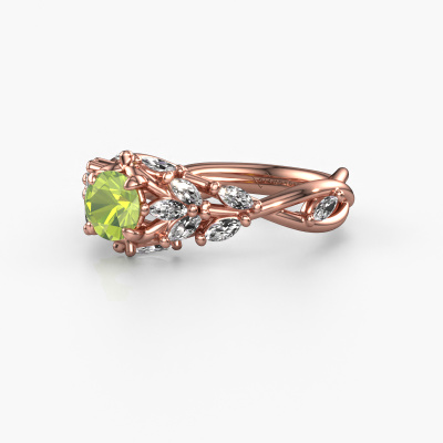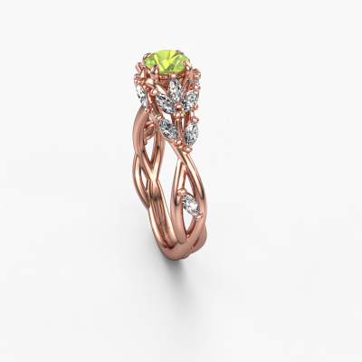 The ring shown above is called the Samantha RND. We call this type of ring a pavé solitaire ring because it has one centre gemstone and a band that is also pave set with gemstones. This engagement ring is made in 14 Carat rose gold set with a 5 mm round peridot, and pave set diamonds at the sides. Each piece of jewellery is made with passion and love by one of our master goldsmiths.This contemporary rose gold pavé solitaire engagement ring has an exquisite round peridot centre stone. To further accentuate the centre stone, the band is set full with more diamonds. Its open prong setting allows light to strike the peridot from various angles and this adds sparkle to your peridot ring. The photo shown above depicts the goldsmith's carefully handcrafted details of the ring. The high positioning of the centre stone is truly eye-catching. The perfect engagement ring for the crown jewel of your life!By using a combination of the latest modern techniques, combined with ancient crafting, we can make all our engagement rings in our own studio. Each jewel is made to order. This is advantageous because we can offer you a price you won't find anywhere else.Our designers and goldsmiths work together each day, creating new jewels. Perhaps you have found a nice contemporary engagement ring somewhere, which can be used to customize your unique ring. Please feel free to contact us. We will make you an offer, based on a fair price/ quality ratio, which will amaze you.To make it easier for you, we offer a 30 day return policy. Check our terms and conditions.