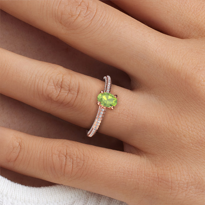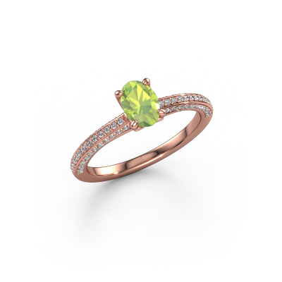 The ring shown above is called the Elenore ovl. We call this type of ring a pavé solitaire ring because it has one centre gemstone and a band that is also pave set with gemstones. This engagement ring is made in 14 Carat rose gold set with a 6.5x4.5 mm oval peridot, and pave set diamonds at the sides. Each piece of jewellery is made by a team of passionate goldsmiths and jewel designers. This will make your crown jewel truly eye-catching.This exclusive rose gold pavé solitaire engagement ring has an exquisite oval peridot centre stone. To further accentuate the centre stone, the band is set full with more diamonds. Its open prong setting allows light to strike the peridot from various angles and this adds sparkle to your peridot ring. The photo shown above depicts the goldsmith's carefully handcrafted details of the ring. The high positioning of the centre stone is truly eye-catching. The perfect engagement ring for the crown jewel of your life!After receiving your order, our goldsmiths will start the creative process of making your Elenore ovl engagement ring. We don't keep stock. This is advantageous because these costs will not be passed on to you. Therefore, we can offer jewellery at exceptionally low prices.Have you found a specific engagement ring somewhere which you would like to give to your loved one? Please feel free to express your wishes to our jewel designers because we would be honoured to turn your design into a exclusive engagement ring. You can follow the development of your ring design because we use 3D drawings. This gives you a realistic preview of how your design will look. You can also preorder a dummy. A dummy is a plastic ring, which can be shaped according your ring design. You can try it on and check if its width and size are suitable for you. We will gladly send you a non-binding offer, based on a fair price/ quality ratio. It will amaze you, considering the quality of the ring and gemstones.To make it easier for you, we offer a 30 day return policy. Check our terms and conditions.