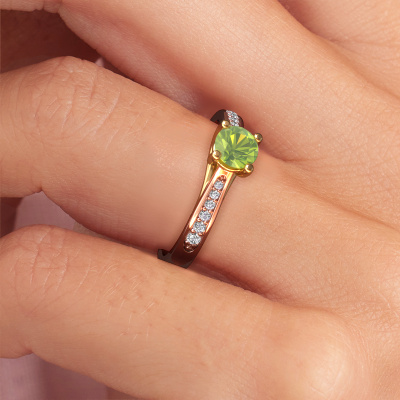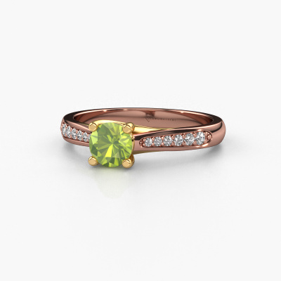 The ring shown above is called the Mia 2. We call this type of ring a pavé solitaire ring because it has one centre gemstone and a band that is also pave set with gemstones. This engagement ring is made in 14 Carat rose gold set with a 5 mm round peridot, and pave set lab-grown diamonds at the sides. Each piece of jewellery is made just for you, with attention to detail and design.This modern rose gold pavé solitaire engagement ring has an exquisite round peridot centre stone. To further accentuate the centre stone, the band is set full with more lab-grown diamonds. Its open prong setting allows light to strike the peridot from various angles and this adds sparkle to your peridot ring. The photo shown above depicts the goldsmith's carefully handcrafted details of the ring. The high positioning of the centre stone is truly eye-catching. The perfect engagement ring for the crown jewel of your life!By using our modern techniques, we can design and customize the finest quality jewels with the utmost care for you. Our engagement rings are always priced 30 percent lower than other jewellers. We make engagement rings to order so we don't have to maintain a large stock. If you have a certain budget, we are more than happy to advice you accordingly.Different styles of new rings are made daily by our team. Perhaps you have found a pavé solitaire engagement ring somewhere. One you would like to give to your loved one. Please feel free to share your thoughts and design with our jewel designers. We would love to turn your design into a modern engagement ring. You can follow the development of your ring design because we use very detailed 3D drawings. On top of that, you can order a dummy of the design. A dummy is a plastic ring, which can be shaped according your ring design. You can try it on and check if the engagement ring is up to standard. We will gladly send you a non-binding offer, based on a fair price/ quality ratio. The offer will baffle you, considering the quality of the ring and gemstones.To make it easier for you, we offer a 30 day return policy. Check our terms and conditions.