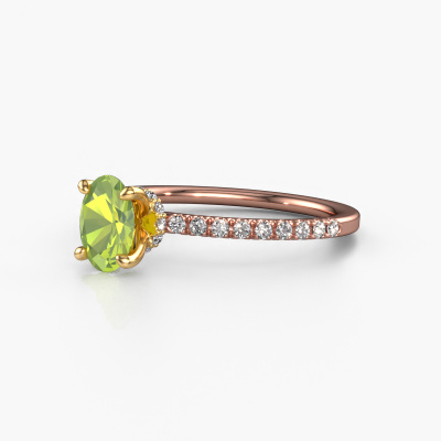 The ring shown above is called the Crystal OVL 4. We call this type of ring a pavé solitaire ring because it has one centre gemstone and a band that is also pave set with gemstones. The 14 Carat rose gold engagement ring is set with a oval 7x5 mm peridot centre stone and the band is pave set with diamond gemstones. Each jewel is made with passion and love by one of our master goldsmiths.This contemporary rose gold pavé solitaire engagement ring has an exquisite oval peridot centre stone. To further accentuate the centre stone, the band is fully set with more diamonds. Its open prong setting allows light to strike the peridot from various angles and this adds sparkle to your peridot ring. The photo shown above depicts the goldsmith's carefully handcrafted details of the ring. The high positioning of the centre stone is truly eye-catching. The perfect engagement ring for the crown jewel of your life! After receiving your order, our goldsmiths will passionately start the creative process of making your engagement ring in our own studio. Because we don't have a big stockpile, these costs will not be passed on to you. Our pricing is proof of that! We offer top quality jewels at lowest price, guaranteed.Our team adds new designs to our online collection daily. Our designers and goldsmiths work together in creating the best design. We strive to offer a diverse collection of jewels. Perhaps you have a specific jewel design in mind. One you came across somewhere. Please contact us for a free consultation. We will make you an offer, based on a fair price/ quality ratio, that will baffle you.To make it easier for you, we offer a 30 day return policy. Check our terms and conditions.
