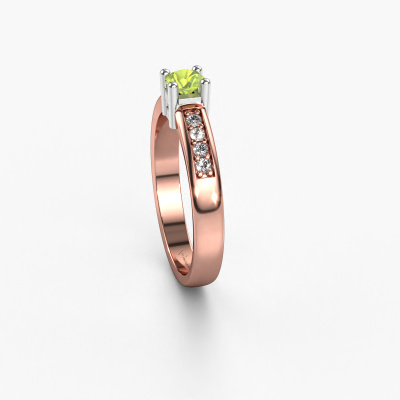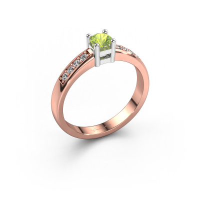 The ring shown above is called the Eline 2. We call this type of ring a pavé solitaire ring because it has one centre gemstone and a band that is also pave set with gemstones. The 14 Carat rose gold engagement ring is set with a round 3.7 mm peridot centre stone and the band is pave set with diamond gemstones. Each jewel is unique in every way! Simply customize to your liking,This modern rose gold pavé solitaire engagement ring has an exquisite round peridot centre stone. To further accentuate the centre stone, the band is fully set with more diamonds. Its open prong setting allows light to strike the peridot from various angles and this adds sparkle to your peridot ring. The photo shown above depicts the goldsmith's carefully handcrafted details of the ring. The high positioning of the centre stone is truly eye-catching. The perfect engagement ring for the crown jewel of your life! Because we design and deliver our own rings, we can offer you a engagement ring at a price you won't find anywhere else. A ring is made to order, which helps prevent excess supplies, so we can make you a great price offer. We understand it feels risky, buying your engagement ring online, but we will gladly assist in the designing process, taking your budget into consideration.Our team adds new designs to our online collection daily. Our designers and goldsmiths work together in creating the best design. We strive to offer a diverse collection of jewels. Perhaps you have a specific jewel design in mind. One you came across somewhere. Please contact us for a free consultation. We will make you an offer, based on a fair price/ quality ratio, that will baffle you.To make it easier for you, we offer a 30 day return policy. Check our terms and conditions.