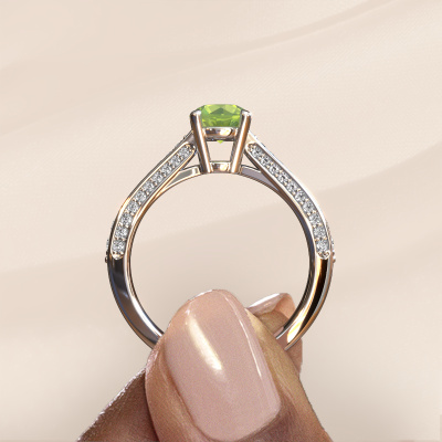 The ring shown above is called the Ruby rnd. We call this type of ring a pavé solitaire ring because it has one centre gemstone and a band that is also pave set with gemstones. This engagement ring is made in 14 Carat white gold set with a 5.7 mm round peridot, and pave set diamonds at the sides. Each piece of jewellery is made just for you, with attention to detail and design.This exclusive white gold pavé solitaire engagement ring has an exquisite round peridot centre stone. To further accentuate the centre stone, the band is set full with more diamonds. Its open prong setting allows light to strike the peridot from various angles and this adds sparkle to your peridot ring. The photo shown above depicts the goldsmith's carefully handcrafted details of the ring. The high positioning of the centre stone is truly eye-catching. The perfect engagement ring for the crown jewel of your life!Because we design and deliver our own rings, we can offer you a engagement ring at a price you won't find anywhere else. A ring is made to order, which helps prevent excess supplies, so we can make you a great price offer. We understand it feels risky, buying your engagement ring online, but we will gladly assist in the designing process, taking your budget into consideration.Do you have a specific ring in mind? One you came across somewhere. Please feel free to tell us your wishes and we will turn your design into a unique engagement ring. You can follow the development of your ring design because we use 3D drawings. This gives you a realistic preview of your design. We will gladly send you a non-binding offer, based on a fair price/ quality ratio. It will amaze you.To make it easier for you, we offer a 30 day return policy. Check our terms and conditions.