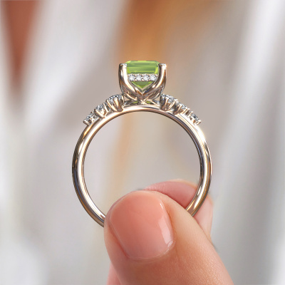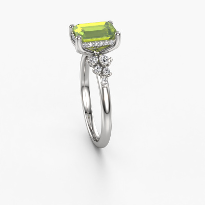The ring shown above is called the Emma EME. We call this type of ring a pavé solitaire ring because it has one centre gemstone and a band that is also pave set with gemstones. This engagement ring is made in 14 Carat white gold set with a 8x6 mm emerald cut peridot, and pave set lab-grown diamonds at the sides. Each piece of jewellery is made with passion and love by one of our master goldsmiths.This fantasy white gold pavé solitaire engagement ring has an exquisite emerald cut peridot centre stone. To further accentuate the centre stone, the band is set full with more lab-grown diamonds. Its open prong setting allows light to strike the peridot from various angles and this adds sparkle to your peridot ring. The photo shown above depicts the goldsmith's carefully handcrafted details of the ring. The high positioning of the centre stone is truly eye-catching. The perfect engagement ring for the crown jewel of your life!After receiving your order, our goldsmiths will passionately start the creative process of making your engagement ring in our own studio. Because we don't have a big stockpile, these costs will not be passed on to you. Our pricing is proof of that! We offer top quality jewels at lowest price, guaranteed.Our team adds new designs to our online collection daily. Our designers and goldsmiths work together in creating the best design. We strive to offer a diverse collection of jewels. Perhaps you have a specific jewel design in mind. One you came across somewhere. Please contact us for a free consultation. We will make you an offer, based on a fair price/ quality ratio, that will baffle you.To make it easier for you, we offer a 30 day return policy. Check our terms and conditions.