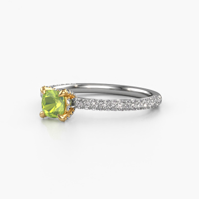 The ring shown above is called the Saskia 2 cus. We call this type of ring a pavé solitaire ring because it has one centre gemstone and a band that is also pave set with gemstones. The 14 Carat white gold engagement ring is set with a cushion 4.5 mm peridot centre stone and the band is pave set with lab grown diamond gemstones. Each jewel is made just for you, with attention to detail and design.This contemporary white gold pavé solitaire engagement ring has an exquisite cushion peridot centre stone. To further accentuate the centre stone, the band is fully set with more lab-grown diamonds. Its open prong setting allows light to strike the peridot from various angles and this adds sparkle to your peridot ring. The photo shown above depicts the goldsmith's carefully handcrafted details of the ring. The high positioning of the centre stone is truly eye-catching. The perfect engagement ring for the crown jewel of your life! Are you on a budget? Please feel free to contact us, so we can go discuss your options. We offer our engagement rings at guaranteed best price, because we make them to order. You won't find such a price anywhere else!Our designers and goldsmiths work together each day, creating new jewels. Perhaps you have found a nice contemporary engagement ring somewhere, which can be used to customize your unique ring. Please feel free to contact us. We will make you an offer, based on a fair price/ quality ratio, which will amaze you.To make it easier for you, we offer a 30 day return policy. Check our terms and conditions.