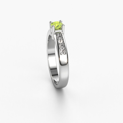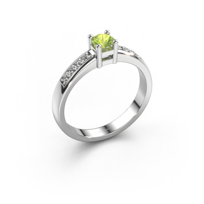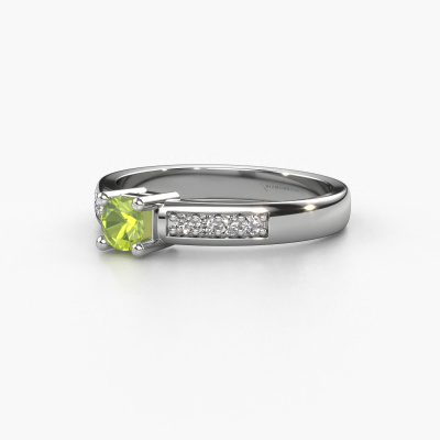 The ring shown above is called the Eline 2. We call this type of ring a pavé solitaire ring because it has one centre gemstone and a band that is also pave set with gemstones. The 14 Carat white gold engagement ring is set with a round 3.7 mm peridot centre stone and the band is pave set with diamond gemstones. Each jewel is unique in every way! Simply customize to your liking,This modern white gold pavé solitaire engagement ring has an exquisite round peridot centre stone. To further accentuate the centre stone, the band is fully set with more diamonds. Its open prong setting allows light to strike the peridot from various angles and this adds sparkle to your peridot ring. The photo shown above depicts the goldsmith's carefully handcrafted details of the ring. The high positioning of the centre stone is truly eye-catching. The perfect engagement ring for the crown jewel of your life! Because we design and deliver our own rings, we can offer you a engagement ring at a price you won't find anywhere else. A ring is made to order, which helps prevent excess supplies, so we can make you a great price offer. We understand it feels risky, buying your engagement ring online, but we will gladly assist in the designing process, taking your budget into consideration.Our team adds new designs to our online collection daily. Our designers and goldsmiths work together in creating the best design. We strive to offer a diverse collection of jewels. Perhaps you have a specific jewel design in mind. One you came across somewhere. Please contact us for a free consultation. We will make you an offer, based on a fair price/ quality ratio, that will baffle you.To make it easier for you, we offer a 30 day return policy. Check our terms and conditions.