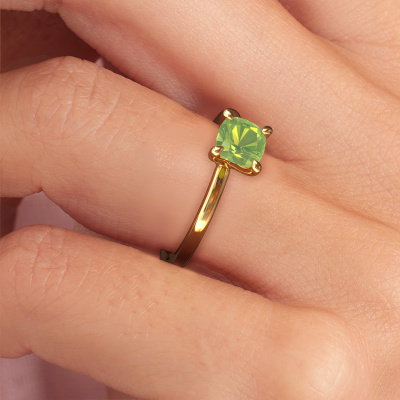 The ring shown above is called the Crystal CUS 1, we call this a solitaire ring because it contains a single gemstone. The engagement ring is made in 14 Carat gold and has a cushion peridot of 5.5 mm. The cool thing about our configurator is that you can compile your own piece of jewellery, into a completely personalized one. This solitaire ring is crafted in the precious metals gold with gold, but of course you are free to pick your own colours. Each piece of jewellery is made with passion and love by one of our master goldsmiths.The solitaire ring is a special type of engagement ring. Its open prong setting allows light to strike the gemstone from various angles. This contemporary engagement ring is a stunning eye-catcher because of the high positioning of the gemstone. In order for you to commemorate your proposal with a unique ring, we carefully adorn this solitaire ring by hand. The love of your life deserves nothing but the best. Because we design and deliver our own rings, we can offer you a engagement ring at a price you won't find anywhere else. A ring is made to order, which helps prevent excess supplies, so we can make you a great price offer. We understand it feels risky, buying your engagement ring online, but we will gladly assist in the designing process, taking your budget into consideration.Our team adds new designs to our online collection daily. Our designers and goldsmiths work together in creating the best design. We strive to offer a diverse collection of jewels. Perhaps you have a specific jewel design in mind. One you came across somewhere. Please contact us for a free consultation. We will make you an offer, based on a fair price/ quality ratio, that will baffle you.To make it easier for you, we offer a 30 day return policy. Check our terms and conditions.