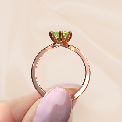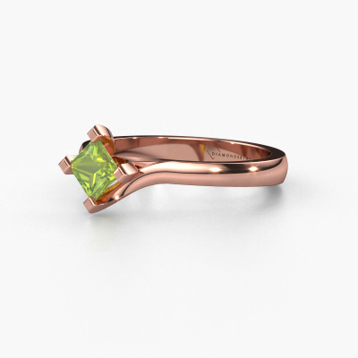 In your eyes, no one else compares to her. She is one in a million, unlike anyone else and pure? These qualities are emphasized perfectly by our modern rose gold solitaire peridot ring. This peridot is carefully selected by our keen artisan goldsmiths. It equals the unique qualities of the love of your life. There is no better way to memorialize your proposal than this symbol of true love. The ring shown above is called the Dewi Square, we call this a solitaire ring because it contains a single gemstone. The Engagement ring is made in 14 Carat rose gold and has a princess peridot of 4 mm. Each piece of jewellery is made just for you by our master goldsmiths in our own studio.By using a combination of the latest modern techniques, combined with ancient crafting, we can make all our Engagement rings in our own studio. Each jewel is made to order. This is advantageous because we can offer you a price you won't find anywhere else.Our designers and goldsmiths work together each day, creating new jewels. Perhaps you have found a nice modern Engagement ring somewhere, which can be used to customize your unique ring. Please feel free to contact us. We will make you an offer, based on a fair price/ quality ratio, which will amaze you.To make it easier for you, we offer a 30 day return policy. Check our terms and conditions.