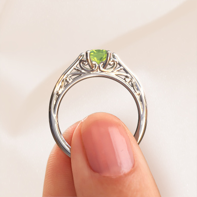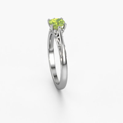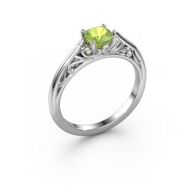 This 14 Carat white gold ring is called Shannon cus and is set with 5 mm peridot. What is it that makes your relationship unique? What is it about her that makes you want to bend down on one knee? The unique bond between the two of you is emphasized by an equally unique ring. A one of a kind ajour solitaire engagement ring made especially for her. That is why this Celtic ring fits her like a glove. Each specific detail of this ajour white gold peridot set engagement ring is hand-picked, crafted and polished by our expert goldsmith. The result is an exquisite ring, unique and perfectly crafted to perfection. That is what our expert Goldsmiths strive for. This jewel is made just for you, with attention to detail and design.By using our modern techniques, we can design and customize the finest quality jewels with the utmost care for you. Our engagement rings are always priced 30 percent lower than other jewellers. We make engagement rings to order so we don't have to maintain a large stock. If you have a certain budget, we are more than happy to advice you accordingly.Our team adds new designs to our online collection daily. Our designers and goldsmiths work together in creating the best design. We strive to offer a diverse collection of jewels. Perhaps you have a specific jewel design in mind. One you came across somewhere. Please contact us for a free consultation. We will make you an offer, based on a fair price/ quality ratio, that will baffle you.To make it easier for you, we offer a 30 day return policy. Check our terms and conditions.