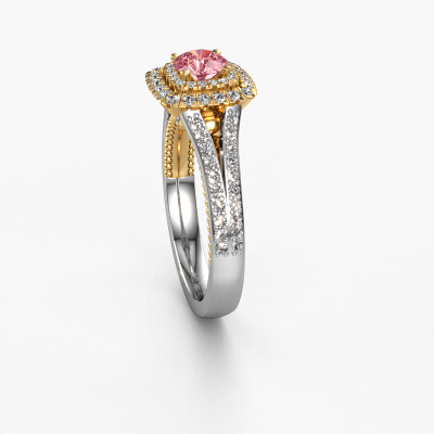 The ring shown above is called the Annette. We call this type of ring a halo ring because it has one centre gemstone and a band that is also pave set with gemstones. The 14 Carat white gold engagement ring is set with a round 5 mm pink lab grown diamond centre stone and the band is pave set with diamond gemstones. Each jewel is made just for you by our master goldsmiths in our own studio.This vintage white gold halo engagement ring has an exquisite round pink lab grown diamond centre stone. To further accentuate the centre stone, the band is fully set with more diamonds. Its open prong setting allows light to strike the pink lab grown diamond from various angles and this adds sparkle to your pink lab grown diamond ring. The photo shown above depicts the goldsmith's carefully handcrafted details of the ring. The high positioning of the centre stone is truly eye-catching. The perfect engagement ring for the crown jewel of your life! After receiving your order, our goldsmiths will passionately start the creative process of making your engagement ring in our own studio. Because we don't have a big stockpile, these costs will not be passed on to you. Our pricing is proof of that! We offer top quality jewels at lowest price, guaranteed.Have you found a specific engagement ring somewhere which you would like to give to your loved one? Please feel free to express your wishes to our jewel designers because we would be honoured to turn your design into a vintage engagement ring. You can follow the development of your ring design because we use 3D drawings. This gives you a realistic preview of how your design will look. You can also preorder a dummy. A dummy is a plastic ring, which can be shaped according your ring design. You can try it on and check if its width and size are suitable for you. We will gladly send you a non-binding offer, based on a fair price/ quality ratio. It will amaze you, considering the quality of the ring and gemstones.To make it easier for you, we offer a 30 day return policy. Check our terms and conditions.