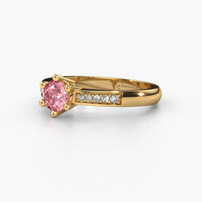 The ring shown above is called the Luna 2. We call this type of ring a pavé solitaire ring because it has one centre gemstone and a band that is also pave set with gemstones. This engagement ring is made in 14 Carat gold set with a 5 mm round pink lab grown diamond, and pave set diamonds at the sides. Each piece of jewellery is unique in every way! Simply customize to your liking,This classic gold pavé solitaire engagement ring has an exquisite round pink lab grown diamond centre stone. To further accentuate the centre stone, the band is set full with more diamonds. Its open prong setting allows light to strike the pink lab grown diamond from various angles and this adds sparkle to your pink lab grown diamond ring. The photo shown above depicts the goldsmith's carefully handcrafted details of the ring. The high positioning of the centre stone is truly eye-catching. The perfect engagement ring for the crown jewel of your life!Because we design and deliver our own rings, we can offer you a engagement ring at a price you won't find anywhere else. A ring is made to order, which helps prevent excess supplies, so we can make you a great price offer. We understand it feels risky, buying your engagement ring online, but we will gladly assist in the designing process, taking your budget into consideration.Our team adds new designs to our online collection daily. Our designers and goldsmiths work together in creating the best design. We strive to offer a diverse collection of jewels. Perhaps you have a specific jewel design in mind. One you came across somewhere. Please contact us for a free consultation. We will make you an offer, based on a fair price/ quality ratio, that will baffle you.To make it easier for you, we offer a 30 day return policy. Check our terms and conditions.