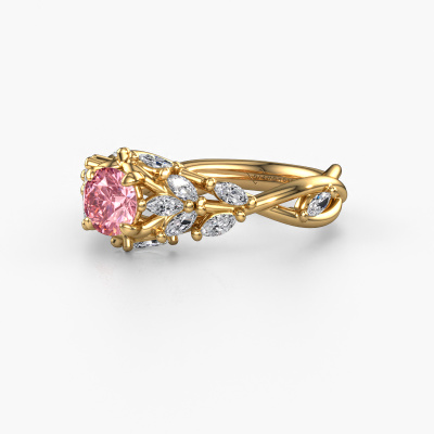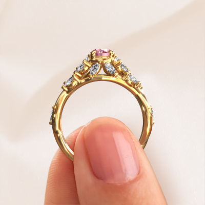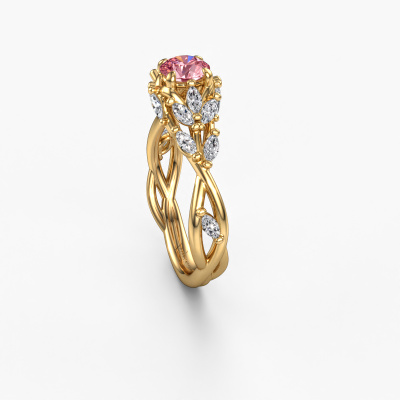 The ring shown above is called the Samantha RND. We call this type of ring a pavé solitaire ring because it has one centre gemstone and a band that is also pave set with gemstones. This engagement ring is made in 14 Carat gold set with a 5 mm round pink lab grown diamond, and pave set diamonds at the sides. Each piece of jewellery is made with passion and love by one of our master goldsmiths.This contemporary gold pavé solitaire engagement ring has an exquisite round pink lab grown diamond centre stone. To further accentuate the centre stone, the band is set full with more diamonds. Its open prong setting allows light to strike the pink lab grown diamond from various angles and this adds sparkle to your pink lab grown diamond ring. The photo shown above depicts the goldsmith's carefully handcrafted details of the ring. The high positioning of the centre stone is truly eye-catching. The perfect engagement ring for the crown jewel of your life!By using a combination of the latest modern techniques, combined with ancient crafting, we can make all our engagement rings in our own studio. Each jewel is made to order. This is advantageous because we can offer you a price you won't find anywhere else.Our designers and goldsmiths work together each day, creating new jewels. Perhaps you have found a nice contemporary engagement ring somewhere, which can be used to customize your unique ring. Please feel free to contact us. We will make you an offer, based on a fair price/ quality ratio, which will amaze you.To make it easier for you, we offer a 30 day return policy. Check our terms and conditions.