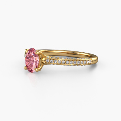 The ring shown above is called the Elenore ovl. We call this type of ring a pavé solitaire ring because it has one centre gemstone and a band that is also pave set with gemstones. This engagement ring is made in 14 Carat gold set with a 6.5x4.5 mm oval pink lab grown diamond, and pave set diamonds at the sides. Each piece of jewellery is made by a team of passionate goldsmiths and jewel designers. This will make your crown jewel truly eye-catching.This exclusive gold pavé solitaire engagement ring has an exquisite oval pink lab grown diamond centre stone. To further accentuate the centre stone, the band is set full with more diamonds. Its open prong setting allows light to strike the pink lab grown diamond from various angles and this adds sparkle to your pink lab grown diamond ring. The photo shown above depicts the goldsmith's carefully handcrafted details of the ring. The high positioning of the centre stone is truly eye-catching. The perfect engagement ring for the crown jewel of your life!After receiving your order, our goldsmiths will start the creative process of making your Elenore ovl engagement ring. We don't keep stock. This is advantageous because these costs will not be passed on to you. Therefore, we can offer jewellery at exceptionally low prices.Have you found a specific engagement ring somewhere which you would like to give to your loved one? Please feel free to express your wishes to our jewel designers because we would be honoured to turn your design into a exclusive engagement ring. You can follow the development of your ring design because we use 3D drawings. This gives you a realistic preview of how your design will look. You can also preorder a dummy. A dummy is a plastic ring, which can be shaped according your ring design. You can try it on and check if its width and size are suitable for you. We will gladly send you a non-binding offer, based on a fair price/ quality ratio. It will amaze you, considering the quality of the ring and gemstones.To make it easier for you, we offer a 30 day return policy. Check our terms and conditions.