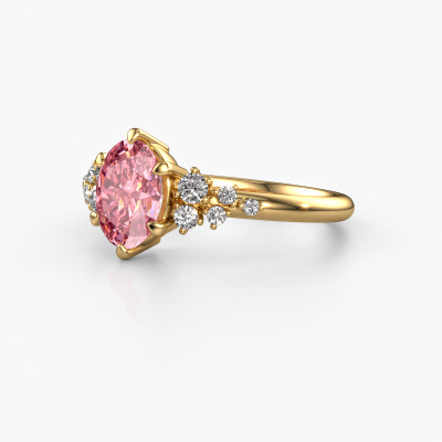 The ring shown above is called the Royce OVL. We call this type of ring a pavé solitaire ring because it has one centre gemstone and a band that is also pave set with gemstones. This engagement ring is made in 14 Carat gold set with a 8x6 mm oval pink lab grown diamond, and pave set lab-grown diamonds at the sides. Each piece of jewellery is made with passion and love by one of our master goldsmiths.This fantasy gold pavé solitaire engagement ring has an exquisite oval pink lab grown diamond centre stone. To further accentuate the centre stone, the band is set full with more lab-grown diamonds. Its open prong setting allows light to strike the pink lab grown diamond from various angles and this adds sparkle to your pink lab grown diamond ring. The photo shown above depicts the goldsmith's carefully handcrafted details of the ring. The high positioning of the centre stone is truly eye-catching. The perfect engagement ring for the crown jewel of your life!After receiving your order, our goldsmiths will passionately start the creative process of making your engagement ring in our own studio. Because we don't have a big stockpile, these costs will not be passed on to you. Our pricing is proof of that! We offer top quality jewels at lowest price, guaranteed.Have you found a specific engagement ring somewhere which you would like to give to your loved one? Please feel free to express your wishes to our jewel designers because we would be honoured to turn your design into a fantasy engagement ring. You can follow the development of your ring design because we use 3D drawings. This gives you a realistic preview of how your design will look. You can also preorder a dummy. A dummy is a plastic ring, which can be shaped according your ring design. You can try it on and check if its width and size are suitable for you. We will gladly send you a non-binding offer, based on a fair price/ quality ratio. It will amaze you, considering the quality of the ring and gemstones.To make it easier for you, we offer a 30 day return policy. Check our terms and conditions.