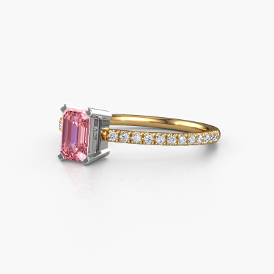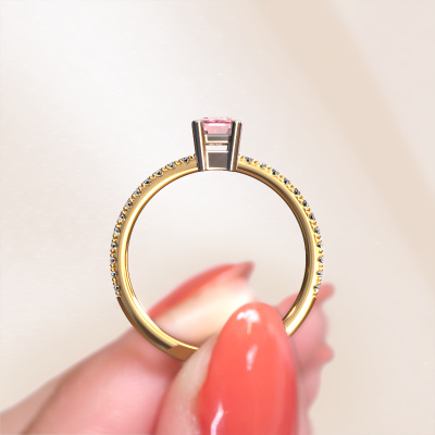 The ring shown above is called the Denita 2 EME. We call this type of ring a pavé solitaire ring because it has one centre gemstone and a band that is also pave set with gemstones. This engagement ring is made in 14 Carat gold set with a 6x4 mm emerald cut pink lab grown diamond, and pave set diamonds at the sides. Each piece of jewellery is made just for you by our master goldsmiths in our own studio.This traditional gold pavé solitaire engagement ring has an exquisite emerald cut pink lab grown diamond centre stone. To further accentuate the centre stone, the band is set full with more diamonds. Its open prong setting allows light to strike the pink lab grown diamond from various angles and this adds sparkle to your pink lab grown diamond ring. The photo shown above depicts the goldsmith's carefully handcrafted details of the ring. The high positioning of the centre stone is truly eye-catching. The perfect engagement ring for the crown jewel of your life!Are you on a budget? Please feel free to contact us, so we can go discuss your options. We offer our engagement rings at guaranteed best price, because we make them to order. You won't find such a price anywhere else!Our team adds new designs to our online collection daily. Our designers and goldsmiths work together in creating the best design. We strive to offer a diverse collection of jewels. Perhaps you have a specific jewel design in mind. One you came across somewhere. Please contact us for a free consultation. We will make you an offer, based on a fair price/ quality ratio, that will baffle you.To make it easier for you, we offer a 30 day return policy. Check our terms and conditions.