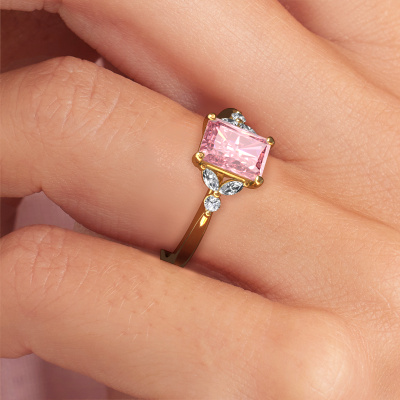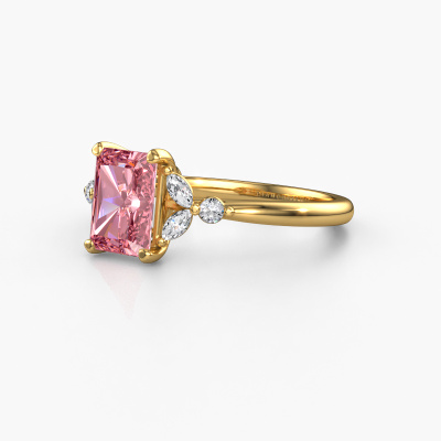 The ring shown above is called the Megan RAD. We call this type of ring a pavé solitaire ring because it has one centre gemstone and a band that is also pave set with gemstones. This engagement ring is made in 14 Carat gold set with a 7.5x5.5 mm radiant pink lab grown diamond, and pave set lab-grown diamonds at the sides. Each piece of jewellery is made with passion and love by one of our master goldsmiths.This traditional gold pavé solitaire engagement ring has an exquisite radiant pink lab grown diamond centre stone. To further accentuate the centre stone, the band is set full with more lab-grown diamonds. Its open prong setting allows light to strike the pink lab grown diamond from various angles and this adds sparkle to your pink lab grown diamond ring. The photo shown above depicts the goldsmith's carefully handcrafted details of the ring. The high positioning of the centre stone is truly eye-catching. The perfect engagement ring for the crown jewel of your life!By using our modern techniques, we can design and customize the finest quality jewels with the utmost care for you. Our engagement rings are always priced 30 percent lower than other jewellers. We make engagement rings to order so we don't have to maintain a large stock. If you have a certain budget, we are more than happy to advice you accordingly.Our team adds new designs to our online collection daily. Our designers and goldsmiths work together in creating the best design. We strive to offer a diverse collection of jewels. Perhaps you have a specific jewel design in mind. One you came across somewhere. Please contact us for a free consultation. We will make you an offer, based on a fair price/ quality ratio, that will baffle you.To make it easier for you, we offer a 30 day return policy. Check our terms and conditions.