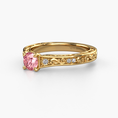 The ring shown above is called the Mallory rnd. We call this type of ring a pavé solitaire ring because it has one centre gemstone and a band that is also pave set with gemstones. This engagement ring is made in 14 Carat gold set with a 5 mm round pink lab grown diamond, and pave set lab-grown diamonds at the sides. Each piece of jewellery is made just for you by our master goldsmiths in our own studio.This vintage gold pavé solitaire engagement ring has an exquisite round pink lab grown diamond centre stone. To further accentuate the centre stone, the band is set full with more lab-grown diamonds. Its open prong setting allows light to strike the pink lab grown diamond from various angles and this adds sparkle to your pink lab grown diamond ring. The photo shown above depicts the goldsmith's carefully handcrafted details of the ring. The high positioning of the centre stone is truly eye-catching. The perfect engagement ring for the crown jewel of your life!Because we design and deliver our own rings, we can offer you a engagement ring at a price you won't find anywhere else. A ring is made to order, which helps prevent excess supplies, so we can make you a great price offer. We understand it feels risky, buying your engagement ring online, but we will gladly assist in the designing process, taking your budget into consideration.Different styles of new rings are made daily by our team. Perhaps you have found a pavé solitaire engagement ring somewhere. One you would like to give to your loved one. Please feel free to share your thoughts and design with our jewel designers. We would love to turn your design into a vintage engagement ring. You can follow the development of your ring design because we use very detailed 3D drawings. On top of that, you can order a dummy of the design. A dummy is a plastic ring, which can be shaped according your ring design. You can try it on and check if the engagement ring is up to standard. We will gladly send you a non-binding offer, based on a fair price/ quality ratio. The offer will baffle you, considering the quality of the ring and gemstones.To make it easier for you, we offer a 30 day return policy. Check our terms and conditions.