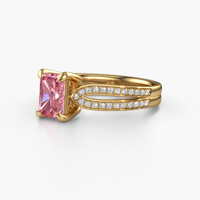 The ring shown above is called the Antonia rad 2. We call this type of ring a pavé solitaire ring because it has one centre gemstone and a band that is also pave set with gemstones. The 14 Carat gold engagement ring is set with a radiant 7x5 mm pink lab grown diamond centre stone and the band is pave set with diamond gemstones. Each jewel is made just for you by our master goldsmiths in our own studio.This chic gold pavé solitaire engagement ring has an exquisite radiant pink lab grown diamond centre stone. To further accentuate the centre stone, the band is fully set with more diamonds. Its open prong setting allows light to strike the pink lab grown diamond from various angles and this adds sparkle to your pink lab grown diamond ring. The photo shown above depicts the goldsmith's carefully handcrafted details of the ring. The high positioning of the centre stone is truly eye-catching. The perfect engagement ring for the crown jewel of your life! Because we design and deliver our own rings, we can offer you a engagement ring at a price you won't find anywhere else. A ring is made to order, which helps prevent excess supplies, so we can make you a great price offer. We understand it feels risky, buying your engagement ring online, but we will gladly assist in the designing process, taking your budget into consideration.Our team adds new designs to our online collection daily. Our designers and goldsmiths work together in creating the best design. We strive to offer a diverse collection of jewels. Perhaps you have a specific jewel design in mind. One you came across somewhere. Please contact us for a free consultation. We will make you an offer, based on a fair price/ quality ratio, that will baffle you.To make it easier for you, we offer a 30 day return policy. Check our terms and conditions.