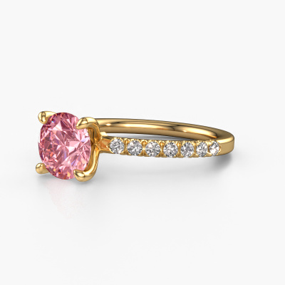 The ring shown above is called the Crystal RND 2. We call this type of ring a pavé solitaire ring because it has one centre gemstone and a band that is also pave set with gemstones. The 14 Carat gold engagement ring is set with a round 7.3 mm pink lab grown diamond centre stone and the band is pave set with lab grown diamond gemstones. Each jewel is unique in every way! Simply customize to your liking,This classic gold pavé solitaire engagement ring has an exquisite round pink lab grown diamond centre stone. To further accentuate the centre stone, the band is fully set with more lab-grown diamonds. Its open prong setting allows light to strike the pink lab grown diamond from various angles and this adds sparkle to your pink lab grown diamond ring. The photo shown above depicts the goldsmith's carefully handcrafted details of the ring. The high positioning of the centre stone is truly eye-catching. The perfect engagement ring for the crown jewel of your life! After receiving your order, our goldsmiths will start the creative process of making your Crystal RND 2 engagement ring. We don't keep stock. This is advantageous because these costs will not be passed on to you. Therefore, we can offer jewellery at exceptionally low prices.Different styles of new rings are made daily by our team. Perhaps you have found a pavé solitaire engagement ring somewhere. One you would like to give to your loved one. Please feel free to share your thoughts and design with our jewel designers. We would love to turn your design into a classic engagement ring. You can follow the development of your ring design because we use very detailed 3D drawings. On top of that, you can order a dummy of the design. A dummy is a plastic ring, which can be shaped according your ring design. You can try it on and check if the engagement ring is up to standard. We will gladly send you a non-binding offer, based on a fair price/ quality ratio. The offer will baffle you, considering the quality of the ring and gemstones.To make it easier for you, we offer a 30 day return policy. Check our terms and conditions.