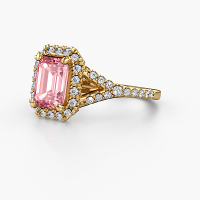 The ring shown above is called the Kimber EME. We call this type of ring a pavé solitaire ring because it has one centre gemstone and a band that is also pave set with gemstones. The 14 Carat gold engagement ring is set with a emerald cut 8x6 mm pink lab grown diamond centre stone and the band is pave set with lab grown diamond gemstones. Each jewel is made by a team of passionate goldsmiths and jewel designers. This will make your crown jewel truly eye-catching.This exclusive gold pavé solitaire engagement ring has an exquisite emerald cut pink lab grown diamond centre stone. To further accentuate the centre stone, the band is fully set with more lab-grown diamonds. Its open prong setting allows light to strike the pink lab grown diamond from various angles and this adds sparkle to your pink lab grown diamond ring. The photo shown above depicts the goldsmith's carefully handcrafted details of the ring. The high positioning of the centre stone is truly eye-catching. The perfect engagement ring for the crown jewel of your life! By using a combination of the latest modern techniques, combined with ancient crafting, we can make all our engagement rings in our own studio. Each jewel is made to order. This is advantageous because we can offer you a price you won't find anywhere else.Our team adds new designs to our online collection daily. Our designers and goldsmiths work together in creating the best design. We strive to offer a diverse collection of jewels. Perhaps you have a specific jewel design in mind. One you came across somewhere. Please contact us for a free consultation. We will make you an offer, based on a fair price/ quality ratio, that will baffle you.To make it easier for you, we offer a 30 day return policy. Check our terms and conditions.