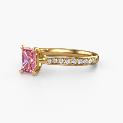 The ring shown above is called the Mignon rad 2. We call this type of ring a pavé solitaire ring because it has one centre gemstone and a band that is also pave set with gemstones. The 14 Carat gold engagement ring is set with a radiant 6.5x4.5 mm pink lab grown diamond centre stone and the band is pave set with diamond gemstones. Each jewel is unique in every way! Simply customize to your liking,This traditional gold pavé solitaire engagement ring has an exquisite radiant pink lab grown diamond centre stone. To further accentuate the centre stone, the band is fully set with more diamonds. Its open prong setting allows light to strike the pink lab grown diamond from various angles and this adds sparkle to your pink lab grown diamond ring. The photo shown above depicts the goldsmith's carefully handcrafted details of the ring. The high positioning of the centre stone is truly eye-catching. The perfect engagement ring for the crown jewel of your life! Are you on a budget? Please feel free to contact us, so we can go discuss your options. We offer our engagement rings at guaranteed best price, because we make them to order. You won't find such a price anywhere else!Have you found a specific engagement ring somewhere which you would like to give to your loved one? Please feel free to express your wishes to our jewel designers because we would be honoured to turn your design into a traditional engagement ring. You can follow the development of your ring design because we use 3D drawings. This gives you a realistic preview of how your design will look. You can also preorder a dummy. A dummy is a plastic ring, which can be shaped according your ring design. You can try it on and check if its width and size are suitable for you. We will gladly send you a non-binding offer, based on a fair price/ quality ratio. It will amaze you, considering the quality of the ring and gemstones.To make it easier for you, we offer a 30 day return policy. Check our terms and conditions.