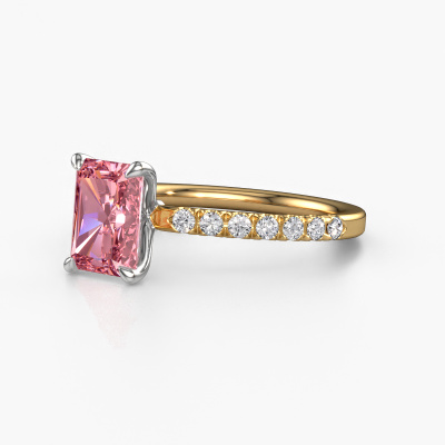 The ring shown above is called the Crystal RAD 2. We call this type of ring a pavé solitaire ring because it has one centre gemstone and a band that is also pave set with gemstones. The 14 Carat gold engagement ring is set with a radiant 8x6 mm pink lab grown diamond centre stone and the band is pave set with lab grown diamond gemstones. Each jewel is made to shine bright around your finger. Each jewel is hand made with love by our goldsmiths.This luxury gold pavé solitaire engagement ring has an exquisite radiant pink lab grown diamond centre stone. To further accentuate the centre stone, the band is fully set with more lab-grown diamonds. Its open prong setting allows light to strike the pink lab grown diamond from various angles and this adds sparkle to your pink lab grown diamond ring. The photo shown above depicts the goldsmith's carefully handcrafted details of the ring. The high positioning of the centre stone is truly eye-catching. The perfect engagement ring for the crown jewel of your life! By using a combination of the latest modern techniques, combined with ancient crafting, we can make all our engagement rings in our own studio. Each jewel is made to order. This is advantageous because we can offer you a price you won't find anywhere else.Our designers and goldsmiths work together each day, creating new jewels. Perhaps you have found a nice luxury engagement ring somewhere, which can be used to customize your unique ring. Please feel free to contact us. We will make you an offer, based on a fair price/ quality ratio, which will amaze you.To make it easier for you, we offer a 30 day return policy. Check our terms and conditions.