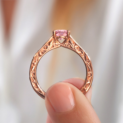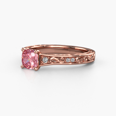 The ring shown above is called the Mallory cus. We call this type of ring a pavé solitaire ring because it has one centre gemstone and a band that is also pave set with gemstones. This engagement ring is made in 14 Carat rose gold set with a 5.5 mm cushion pink lab grown diamond, and pave set diamonds at the sides. Each piece of jewellery is made just for you by our master goldsmiths in our own studio.This Celtic rose gold pavé solitaire engagement ring has an exquisite cushion pink lab grown diamond centre stone. To further accentuate the centre stone, the band is set full with more diamonds. Its open prong setting allows light to strike the pink lab grown diamond from various angles and this adds sparkle to your pink lab grown diamond ring. The photo shown above depicts the goldsmith's carefully handcrafted details of the ring. The high positioning of the centre stone is truly eye-catching. The perfect engagement ring for the crown jewel of your life!By using our modern techniques, we can design and customize the finest quality jewels with the utmost care for you. Our engagement rings are always priced 30 percent lower than other jewellers. We make engagement rings to order so we don't have to maintain a large stock. If you have a certain budget, we are more than happy to advice you accordingly.Different styles of new rings are made daily by our team. Perhaps you have found a pavé solitaire engagement ring somewhere. One you would like to give to your loved one. Please feel free to share your thoughts and design with our jewel designers. We would love to turn your design into a Celtic engagement ring. You can follow the development of your ring design because we use very detailed 3D drawings. On top of that, you can order a dummy of the design. A dummy is a plastic ring, which can be shaped according your ring design. You can try it on and check if the engagement ring is up to standard. We will gladly send you a non-binding offer, based on a fair price/ quality ratio. The offer will baffle you, considering the quality of the ring and gemstones.To make it easier for you, we offer a 30 day return policy. Check our terms and conditions.