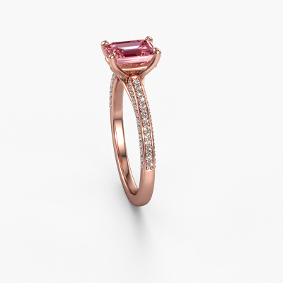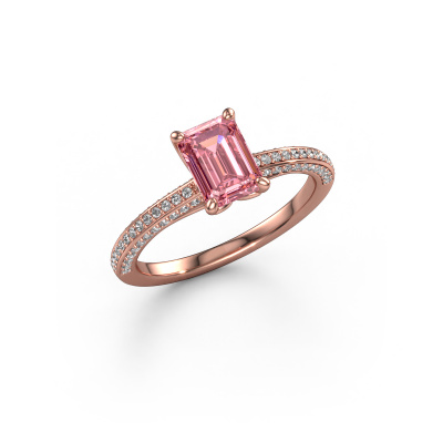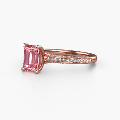 The ring shown above is called the Elenore eme. We call this type of ring a pavé solitaire ring because it has one centre gemstone and a band that is also pave set with gemstones. This engagement ring is made in 14 Carat rose gold set with a 7x5 mm emerald cut pink lab grown diamond, and pave set lab-grown diamonds at the sides. Each piece of jewellery is made just for you, with attention to detail and design.This exclusive rose gold pavé solitaire engagement ring has an exquisite emerald cut pink lab grown diamond centre stone. To further accentuate the centre stone, the band is set full with more lab-grown diamonds. Its open prong setting allows light to strike the pink lab grown diamond from various angles and this adds sparkle to your pink lab grown diamond ring. The photo shown above depicts the goldsmith's carefully handcrafted details of the ring. The high positioning of the centre stone is truly eye-catching. The perfect engagement ring for the crown jewel of your life!Are you on a budget? Please feel free to contact us, so we can go discuss your options. We offer our engagement rings at guaranteed best price, because we make them to order. You won't find such a price anywhere else!Have you found a specific engagement ring somewhere which you would like to give to your loved one? Please feel free to express your wishes to our jewel designers because we would be honoured to turn your design into a exclusive engagement ring. You can follow the development of your ring design because we use 3D drawings. This gives you a realistic preview of how your design will look. You can also preorder a dummy. A dummy is a plastic ring, which can be shaped according your ring design. You can try it on and check if its width and size are suitable for you. We will gladly send you a non-binding offer, based on a fair price/ quality ratio. It will amaze you, considering the quality of the ring and gemstones.To make it easier for you, we offer a 30 day return policy. Check our terms and conditions.