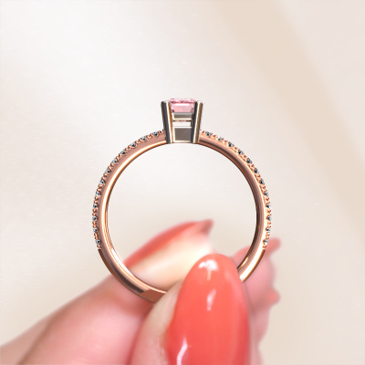 The ring shown above is called the Denita 2 EME. We call this type of ring a pavé solitaire ring because it has one centre gemstone and a band that is also pave set with gemstones. This engagement ring is made in 14 Carat rose gold set with a 6x4 mm emerald cut pink lab grown diamond, and pave set diamonds at the sides. Each piece of jewellery is made just for you by our master goldsmiths in our own studio.This traditional rose gold pavé solitaire engagement ring has an exquisite emerald cut pink lab grown diamond centre stone. To further accentuate the centre stone, the band is set full with more diamonds. Its open prong setting allows light to strike the pink lab grown diamond from various angles and this adds sparkle to your pink lab grown diamond ring. The photo shown above depicts the goldsmith's carefully handcrafted details of the ring. The high positioning of the centre stone is truly eye-catching. The perfect engagement ring for the crown jewel of your life!Are you on a budget? Please feel free to contact us, so we can go discuss your options. We offer our engagement rings at guaranteed best price, because we make them to order. You won't find such a price anywhere else!Our team adds new designs to our online collection daily. Our designers and goldsmiths work together in creating the best design. We strive to offer a diverse collection of jewels. Perhaps you have a specific jewel design in mind. One you came across somewhere. Please contact us for a free consultation. We will make you an offer, based on a fair price/ quality ratio, that will baffle you.To make it easier for you, we offer a 30 day return policy. Check our terms and conditions.