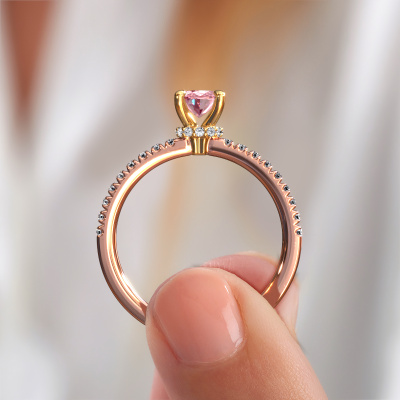 The ring shown above is called the Crystal OVL 4. We call this type of ring a pavé solitaire ring because it has one centre gemstone and a band that is also pave set with gemstones. The 14 Carat rose gold engagement ring is set with a oval 7x5 mm pink lab grown diamond centre stone and the band is pave set with diamond gemstones. Each jewel is made with passion and love by one of our master goldsmiths.This contemporary rose gold pavé solitaire engagement ring has an exquisite oval pink lab grown diamond centre stone. To further accentuate the centre stone, the band is fully set with more diamonds. Its open prong setting allows light to strike the pink lab grown diamond from various angles and this adds sparkle to your pink lab grown diamond ring. The photo shown above depicts the goldsmith's carefully handcrafted details of the ring. The high positioning of the centre stone is truly eye-catching. The perfect engagement ring for the crown jewel of your life! After receiving your order, our goldsmiths will passionately start the creative process of making your engagement ring in our own studio. Because we don't have a big stockpile, these costs will not be passed on to you. Our pricing is proof of that! We offer top quality jewels at lowest price, guaranteed.Our team adds new designs to our online collection daily. Our designers and goldsmiths work together in creating the best design. We strive to offer a diverse collection of jewels. Perhaps you have a specific jewel design in mind. One you came across somewhere. Please contact us for a free consultation. We will make you an offer, based on a fair price/ quality ratio, that will baffle you.To make it easier for you, we offer a 30 day return policy. Check our terms and conditions.
